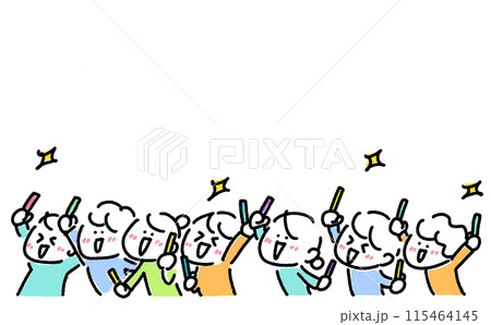 コンサートで熱狂的に盛り上がる人々 ペンライト 男女 若い 歓声 上半身 シンプルな線画イラスト
