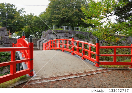 秋の盛岡城跡公園、鶴ヶ池に架かる橋