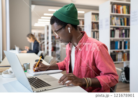 Focused African guy online student taking notes during webinar, studying in library on laptop