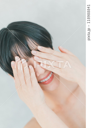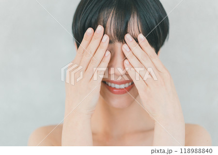 明るい部屋の窓際で、目を隠す、ワンピースをきた若い女性