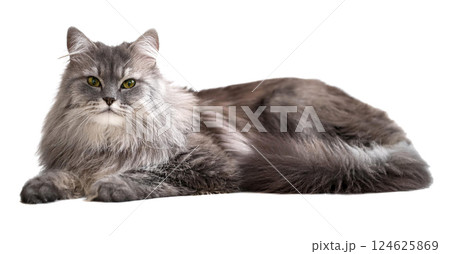 寝転がっている、目つきの悪い灰色の長毛種の猫。白背景。