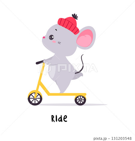 Little Mouse Ride Scooter Demonstrating English Verbs for Educational Activity Vector Illustration