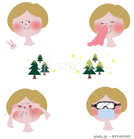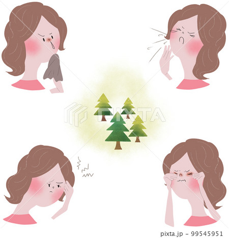 花粉症のアレルギー症状である鼻や目の症状を若い女性とスギやヒノキの花粉飛散で表した五枚のイラスト