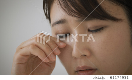 公園で運動中に花粉症・アレルギーで目の痒み・涙目で困る若いアジア人女性