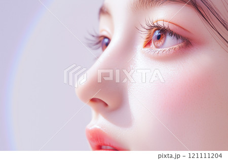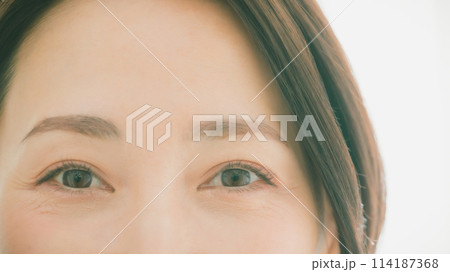 日本人女性の目元アップと素肌の質感を強調した美容スキンケア化粧品の広告に使えるクローズアップ写真