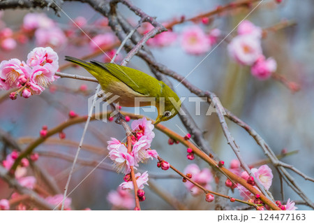 関東・湯河原梅林・梅の花を飛び回り蜜を吸うメジロ、春を満喫する和の風景・神奈川県湯河原町(13)