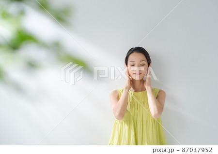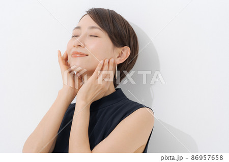 スキンケアをする女性 両手 頬 目瞑り