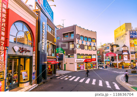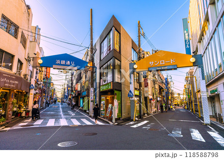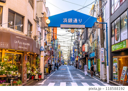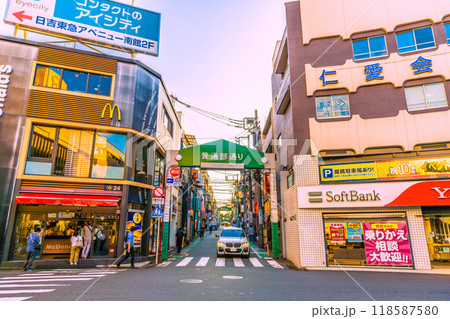 日本の横浜都市景観 9月。東急電鉄 日吉駅前。浜銀通りやサンロードなどを望む