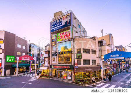 日本の横浜都市景観 9月。東急電鉄 日吉駅前。浜銀通りなどを望む