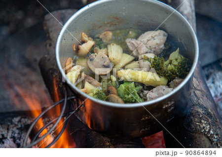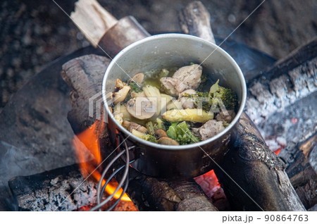 冬のキャンプ、野外で薪ストーブのアウトドア料理