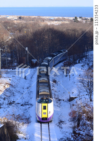 太平洋をバックに小さな峠を越える特急「おおぞら」
