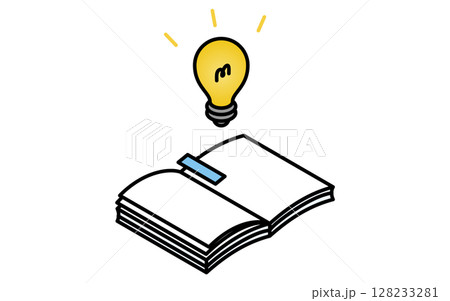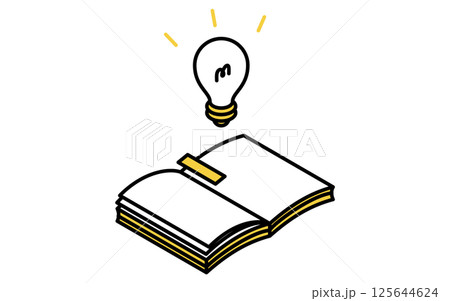 開いた本と光る電球のひらめきのイメージ、シンプルな線画アイコン、アイソメトリックイラスト