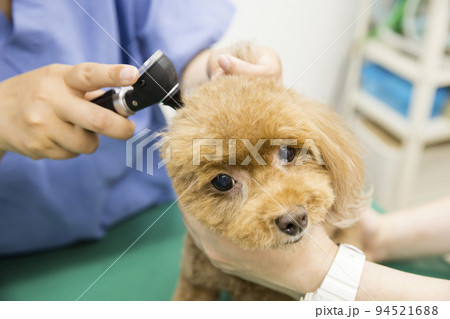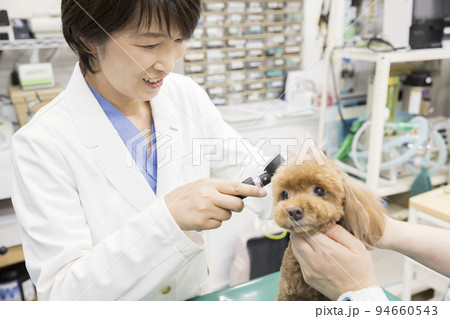 動物病院で小型犬の耳の中を見る女性獣医手元