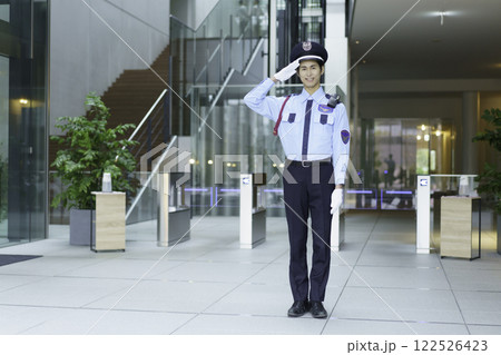 オフィスビルのエントランスロビーに立って敬礼する若い警備員 撮影協力:スカパー東京メディアセンター