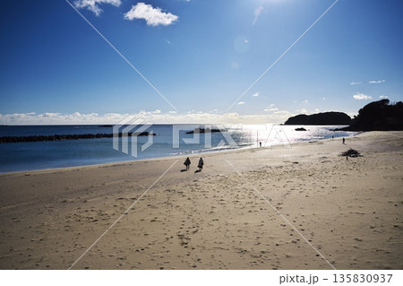 初冬の伊勢志摩 青い空と千鳥ケ浜を歩く観光客
