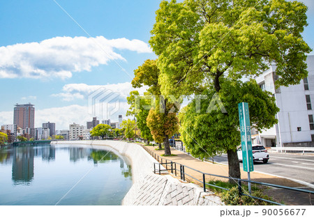 川のある市街地風景です。天満川の下流方面を写しています。広瀬橋から展望。広島県
