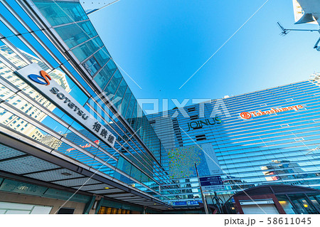 日本の横浜都市景観 横浜タカシマヤのガラスに映るJR横浜タワーや横浜駅。広場の整備完了で広い空間が…