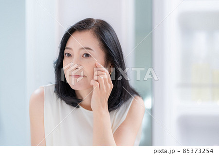 鏡を見てほうれい線を気にするミドルエイジの女性