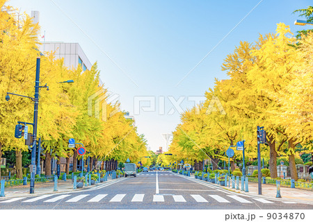 横浜市 日本大通りの黄葉銀杏並木と神奈川県庁