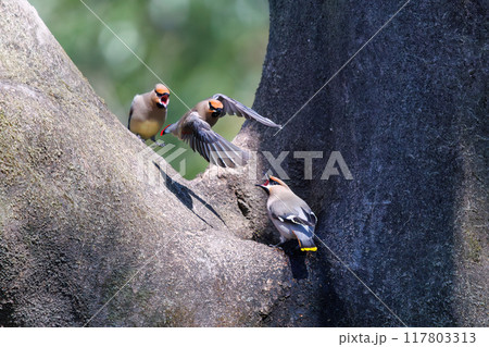 木のウロに溜まった水を飲むために集まり時に争う美しいヒレンジャクとキレンジャクの群れ(レンジャク科)