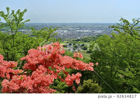 ヤマツツジ咲く佐野市唐沢山城跡の南城跡からの関東平野