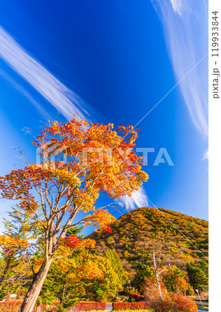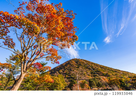 青空と真っ赤なモミジ 榛名湖畔の紅葉