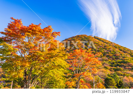 曇り空の榛名富士山頂 秋 紅葉 群馬県高崎市榛名湖町