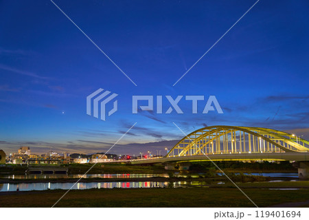 東京都大田区と川崎市中原区に架かる丸子橋の多摩川河川敷から川崎側の月夜景を見る