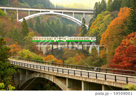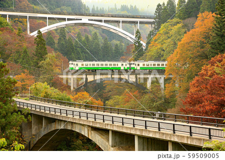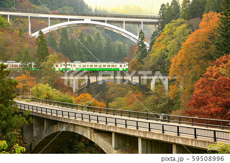 秋の宮下アーチ3橋(兄)弟とJR只見線下り 一番列車