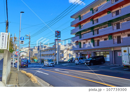 川崎市麻生区高石1丁目24と百合丘1丁目の間の津久井道の交差点から東側(高石3丁目など)を見る