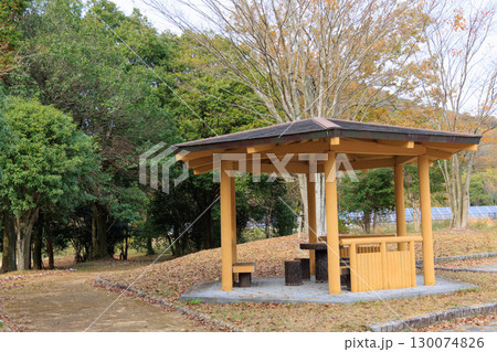 公園でみかける屋根付きの休憩所あずまや(メタセコイア紅葉)