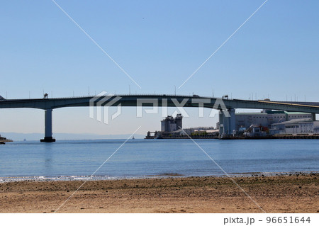 芦屋市 東灘芦屋大橋(県道722号線と阪神高速5号湾岸線が走る)を芦屋川河口の出口付近より望む