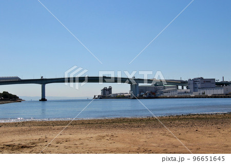芦屋市 東灘芦屋大橋(県道722号線と阪神高速5号湾岸線が走る)を遠くに芦屋川河口の出口付近より望む