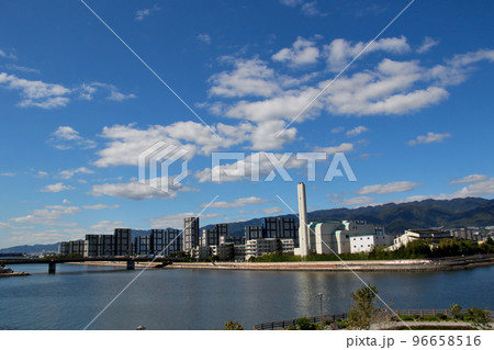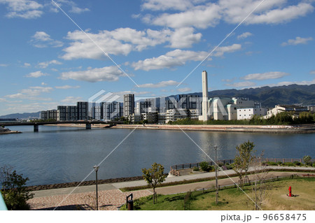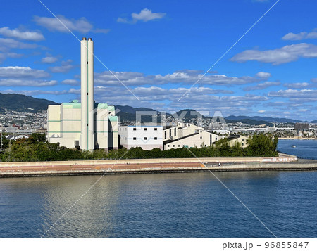 西宮市 西宮浜総合公園から芦屋市の芦屋市環境処理センターのごみ焼却施設とアステム芦屋を望む