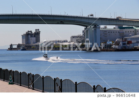 芦屋市 東灘芦屋大橋 県道722号線と阪神高速5号湾岸線が走る。その下を水上スキーが走る。
