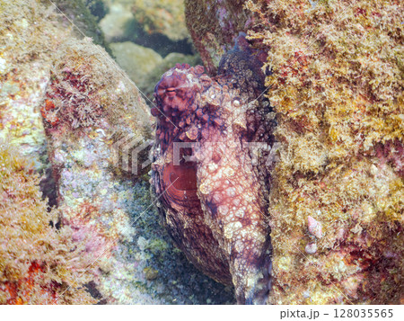 岩の間に隠れる大きな美しいワモンダコ。静岡県伊豆半島賀茂郡南伊豆町中木ヒリゾ浜2024