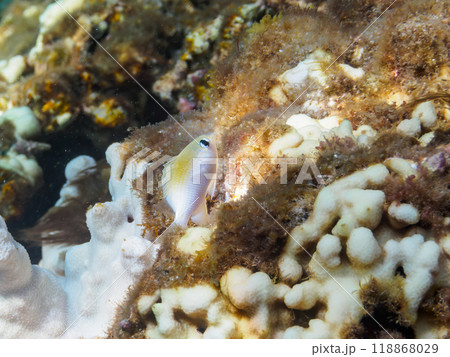 猫目が可愛いネズスズメダイ(スズメダイ科)の幼魚他。静岡県伊豆半島南伊豆町中木ヒリゾ浜-2023年