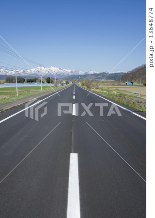 雪被る夕張山地の山々を背景に真っすぐ走る道路