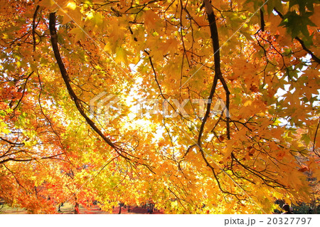 黄色に染まる紅葉 隙間から太陽を見上げる