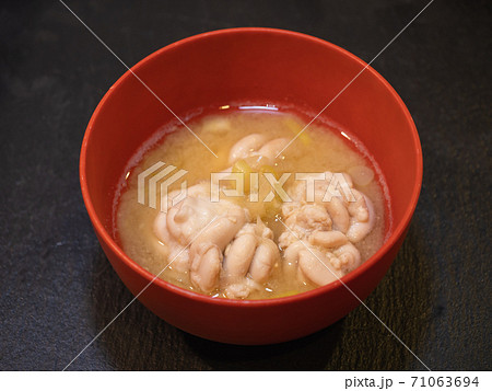 真タラの白子。七味をトッピングした和食の味噌汁。