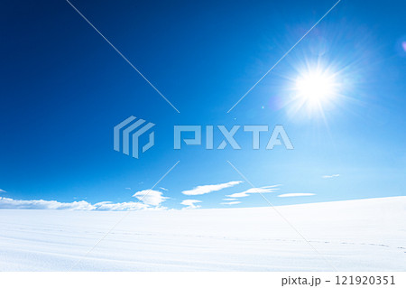冬の北海道らしい雪原と青空と太陽のあるシンプルな風景
