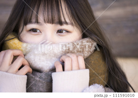 マフラーで顔を隠す若い女性