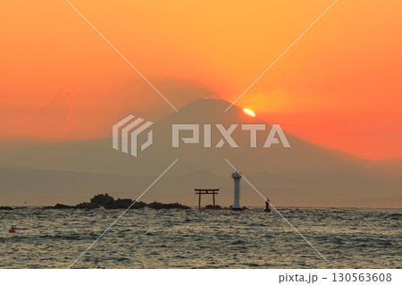 灯台と鳥居の見える海(森戸海岸)