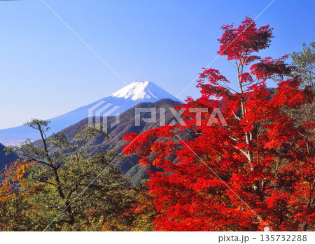 雁ヶ腹摺山へ向かう真木小金沢林道途中の真っ赤な紅葉のを前に冠雪の富士山