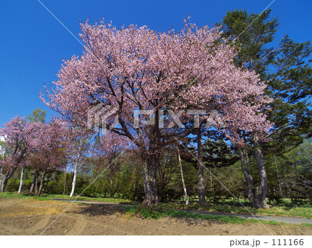 残雪の羊蹄山(蝦夷富士)と蝦夷彼岸桜(真狩神社参道より)「洞爺湖有珠山ジオパーク」