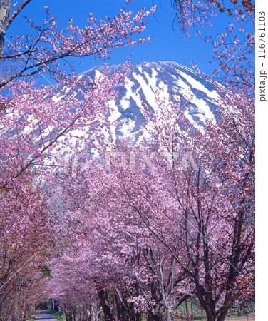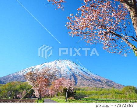 残雪の羊蹄山(蝦夷富士)と蝦夷彼岸桜(真狩神社参道より)「洞爺湖有珠山ジオパーク」