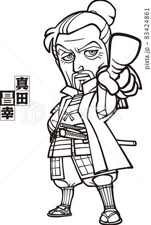 武装して正面を向いて指をさす真田昌幸【3頭身・白黒】