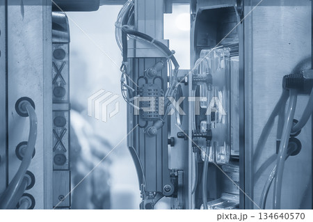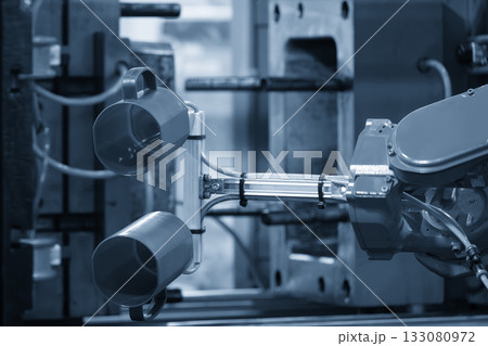 The plastic injection parts gripping by vacuum robotic system from injection machine.