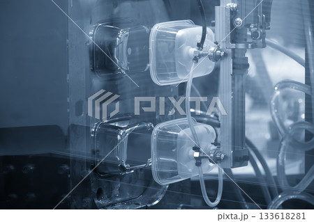 The plastic blow parts from injection machine gripped by vacuum robotic system.