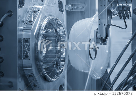 The plastic injection parts gripped by vacuum robotic system from injection mold.